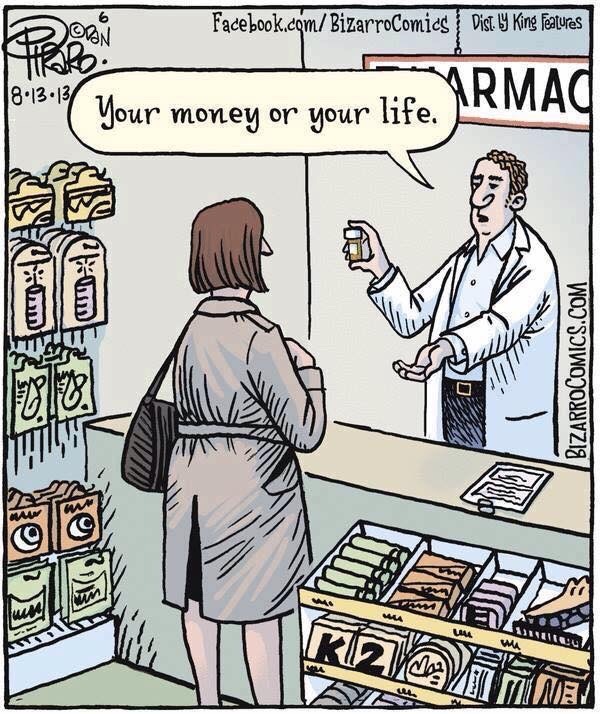 Some of my meds are no longer going to be partially covered by my ridiculously expensive private insurance. I just used the GoodRX website to look it up, and I can either spend $40 at Target to pay for one of them out of pocket–per month–, or I can get it at Sams Club for $4. No that is not a typo. The drug I need to take every single day to keep my allergies from spiraling out of control (yay auto-immune bullshit) is literally ten times cheaper at Sams Club. Holy shit.