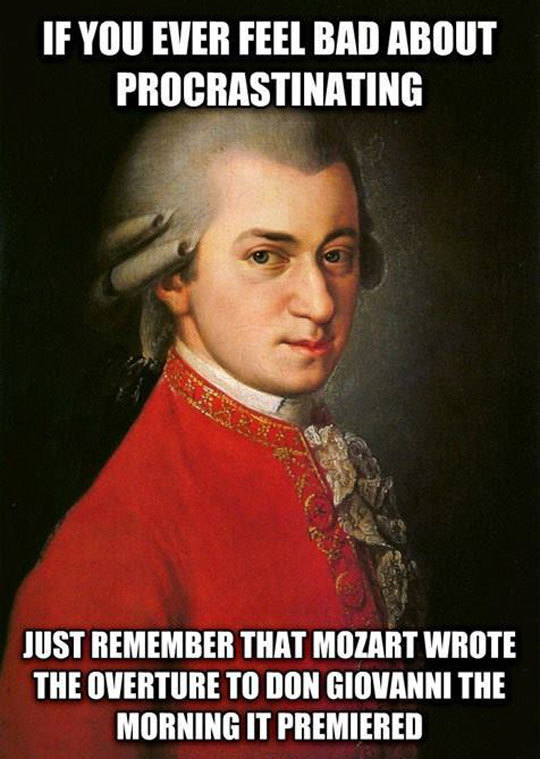 Also one time he was supposed to write a violin and piano duet, and he wrote the violin part, but he didn’t really feel like writing the piano part, or was too lazy etc. When the concert came up (he played the piano while a fiend played the violin) he set up a blank piece of paper (so people would think he was reading music) and improvised. After the concert he wrote it down so it could be published